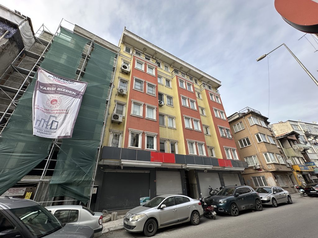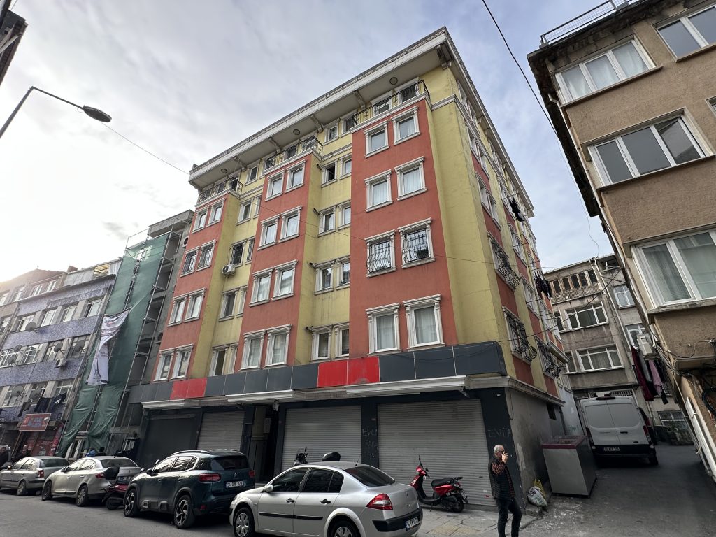 Aksaray Mahallesi’nde, Küçük Langa Caddesi üzerinde konumlanan yapı; cephede pastel tonların kullanıldığı düşey yüzey bölünmeleri ve beyaz çerçeveli pencere düzeniyle tanımlanan bir görünüme sahiptir. Zemin katta kepenkli cephe düzeni görülürken, üst katlarda pencere ritmi ve bazı açıklıklarda güvenlik amaçlı demir korkuluklar dikkat çeker.